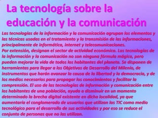 El documento describe las diferentes categorías de tecnologías de información y comunicación. Estas incluyen tecnologías clave basadas en grandes descubrimientos científicos, tecnologías de racionalización que mejoran productos y métodos de fabricación, y tecnologías genéricas ampliamente disponibles. También menciona tecnologías de procedimientos de fabricación, tecnologías industriales para producción masiva, tecnologías alternativas y tecnologías de punta basadas en microelectrónica e informática.