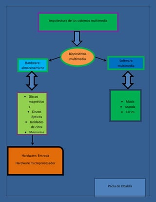 La arquitectura de los sistemas multimedia se compone de hardware como dispositivos de almacenamiento, entrada y microprocesadores, y software multimedia. El hardware proporciona los recursos para que el software multimedia pueda reproducir, grabar y editar audio, video y otros contenidos multimedia.