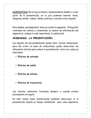 La tecnología se refiere a la aplicación de conocimientos científicos para resolver problemas prácticos. Microsoft PowerPoint es un programa que permite crear presentaciones dividiéndolas en diapositivas, en las cuales se pueden insertar texto, imágenes y otros objetos. PowerPoint ofrece varias opciones para animar y visualizar las presentaciones, así como transiciones entre diapositivas.