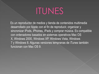 iTunes es un reproductor de medios y tienda de contenidos desarrollado por Apple que permite reproducir, organizar y comprar música para iPods, iPhones, iPads y ordenadores Mac y Windows, además de grabar CD y acceder a la tienda iTunes Store.