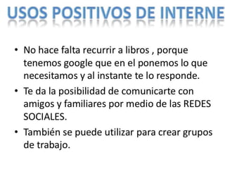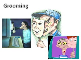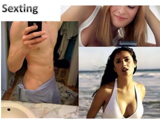 Este documento discute los riesgos de exponerse a contenido inapropiado como pornografía y violencia en internet. También menciona la producción y distribución de pornografía infantil. Luego enumera consejos para usar las redes sociales de manera segura, como no aceptar desconocidos, no publicar información personal y bloquear a personas agresivas. Recomienda que los padres revisen periódicamente el uso que hacen sus hijos de Facebook y las imágenes que publican para evitar exponerse a situaciones de riesgo.