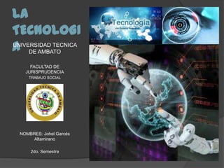 Este documento define la tecnología como el conjunto de conocimientos, habilidades y medios necesarios para lograr un objetivo mediante el uso de artefactos artificiales. Explica que la tecnología influye en el progreso social y económico pero también puede usarse para proteger el medio ambiente. Describe que los métodos tecnológicos incluyen el uso de herramientas e instrumentos y que los principales medios son la energía y la información.