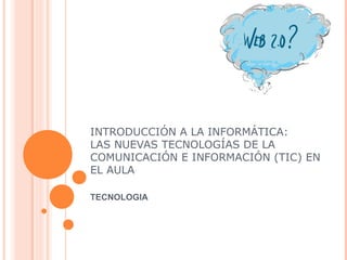 Este documento presenta una introducción a las tecnologías de la información y la comunicación (TIC) en el aula. Explica los objetivos de integrar las TIC en la educación, como promover habilidades con recursos tecnológicos. También describe conceptos clave como Internet, la Web 2.0 y sus aplicaciones educativas, e implicaciones del uso de las TIC en la enseñanza y el aprendizaje.