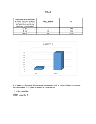 El documento presenta los resultados de 5 encuestas realizadas a 40 personas sobre temas relacionados con la contaminación ambiental. La mayoría de los encuestados considera que la contaminación ambiental es un problema actual (93%) y que la información sobre cómo prevenirla es insuficiente en su ciudad (90%). Todos apoyan las jornadas de limpieza en sus hogares (100%) y casi todos consideran que dar buen manejo a los desechos contribuye a la preservación ambiental (98%). Finalmente, el 70% cree que el enfoque CTS se refiere a ciencia