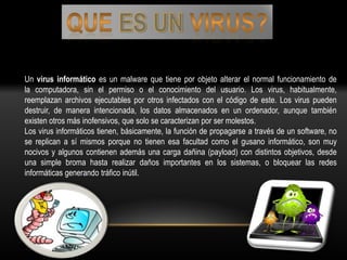 Un virus informático es un malware que altera el funcionamiento de una computadora sin el permiso del usuario, reemplazando archivos ejecutables con código malicioso. Puede destruir datos de forma intencional o ser simplemente molesto. Se propaga a través de software y no se puede replicar solo, siendo muy dañino en algunos casos.