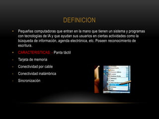 Este documento define las PDA (ordenadores de bolsillo) como pequeñas computadoras portátiles con pantalla táctil que ayudan a los usuarios con tareas como buscar información y usar una agenda electrónica. Explora la historia y evolución de las PDA desde 1975 hasta 1995 y sus usos comunes en automóviles, medicina y educación. También discute las ventajas de la portabilidad de las PDA y sus limitaciones actuales de precio y conocimiento público.