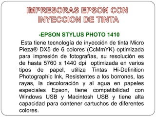 Este documento resume las características y precios de tres impresoras Epson: la Epson Stylus Photo 1410, que tiene alta resolución e imprime fotos en varios tipos de papel utilizando tintas resistentes; la Epson Stylus Photo R2000, que usa tinta pigmentada para imprimir fotos brillantes en diferentes soportes; y la Epson Stylus Photo T50, que imprime fotos de alta calidad a gran velocidad. La marca Epson ofrece una variedad de modelos para satisfacer las necesidades de clientes profesionales y