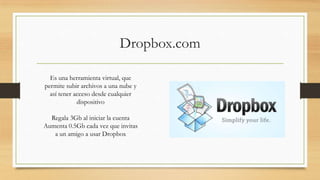 El documento describe tres herramientas de almacenamiento en la nube: Dropbox permite subir archivos a la nube y acceder a ellos desde cualquier dispositivo y regala espacio de almacenamiento adicional a medida que se invitan amigos; Google Drive permite crear, editar y compartir archivos de texto, hojas de cálculo y presentaciones de forma simultánea entre varios usuarios a través de una interfaz amigable; One Drive permite crear y editar de forma interactiva archivos de Office en línea permitiendo que varios usuarios modifiquen la información
