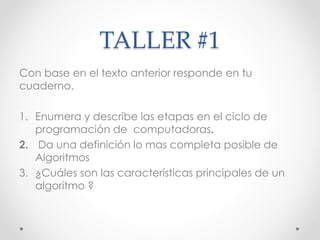 Este documento presenta preguntas sobre algoritmos y diagramas de flujo. Se definen algoritmos como procedimientos para resolver problemas a través de acciones específicas en un orden definido. Se describen las etapas del desarrollo de algoritmos, los tipos de lenguajes algorítmicos como pseudocódigo y diagramas de flujo, y las características de estos últimos como su estructura y simbología.