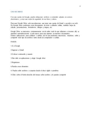 Slideshare y Google Drive son sitios web que permiten a los usuarios almacenar y compartir archivos en línea como presentaciones, documentos y fotos. Slideshare permite subir presentaciones para ser compartidas públicamente o privadamente, mientras que Google Drive ofrece almacenamiento en la nube para editar y sincronizar archivos desde cualquier dispositivo. Ambos requieren crear una cuenta para acceder a las funciones de carga, edición y compartición de archivos en línea.