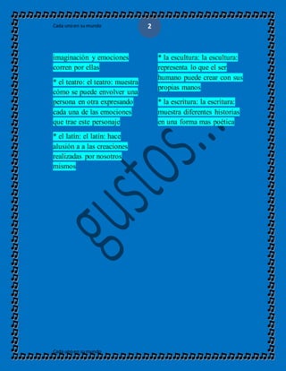 El documento habla sobre diferentes formas de arte como la música, la pintura, el grafiti, la danza, el dibujo, el teatro, la escultura y la escritura. Explica que el arte es una forma de expresar los sentimientos, pensamientos e inspiraciones de una persona. También critica el toreo por considerarlo un acto inhumano y vil que tortura y mata a los toros de forma salvaje e innecesaria.