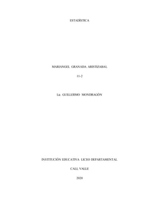 Este documento define la estadística y describe sus tres ramas principales: estadística descriptiva, inferencial y matemática. Luego detalla algunas aplicaciones de la estadística en educación, contabilidad, administración, gerontología, deportes y economía. Finalmente, proporciona definiciones de términos estadísticos clave como hipótesis, variable, dato, población, muestra y medidas. Incluye también ejemplos de diagramas y tablas estadísticas.