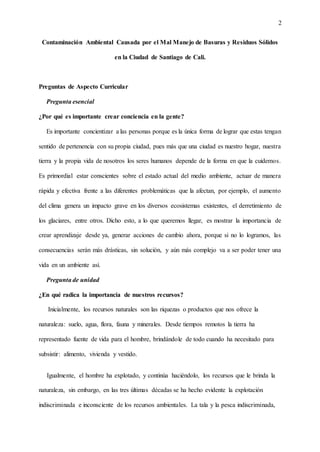 El documento describe la contaminación ambiental causada por el mal manejo de basuras y residuos sólidos en Santiago de Cali. Explica que la ciudad produce 1,816 toneladas de basura diariamente pero solo aprovecha el 20%, causando contaminación del aire, agua y suelo. También habla sobre la importancia de crear conciencia pública para lograr una separación adecuada de residuos en la fuente y un manejo integral de los desechos sólidos.