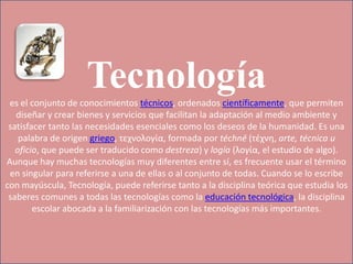 El documento define la tecnología como el conjunto de conocimientos técnicos ordenados científicamente que permiten crear bienes y servicios para satisfacer las necesidades humanas y adaptarse al medio ambiente. Explica que la tecnología influye en el progreso económico y social aunque a veces se enfoca más en satisfacer los deseos de los más prósperos que las necesidades de los más necesitados. También puede usarse para proteger el medio ambiente.