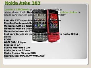 Los documentos proporcionan información sobre diferentes teléfonos celulares, incluyendo sus especificaciones técnicas y precios. Se describen modelos de marcas como Nokia, Samsung, LG, Apple y otros con detalles sobre sus pantallas, cámaras, memoria, procesadores y otros componentes.