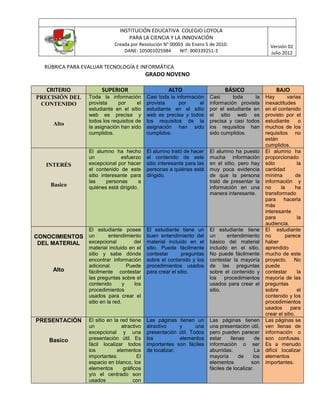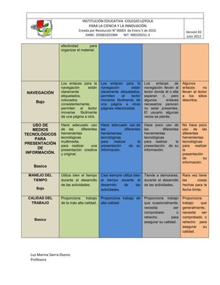 Este documento presenta una rúbrica para evaluar proyectos de tecnología e informática de grado noveno en el Colegio Loyola. La rúbrica evalúa cinco criterios: precisión del contenido, interés, conocimientos del material, presentación y navegación, y uso de medios tecnológicos. Cada criterio se evalúa en cuatro niveles: superior, alto, básico y bajo. La rúbrica provee descripciones para cada nivel en cada criterio.