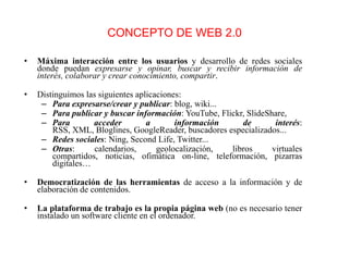 Este documento describe la Web 2.0 y sus aplicaciones principales como blogs, wikis y redes sociales que permiten una mayor interacción entre usuarios y desarrollo de contenidos. También analiza sus implicaciones educativas como un espacio para aprender de forma autónoma y colaborativa y mejorar las competencias digitales de los estudiantes. Finalmente, señala los requisitos necesarios como infraestructuras, competencias digitales y formación del profesorado para un uso educativo efectivo de estas herramientas.