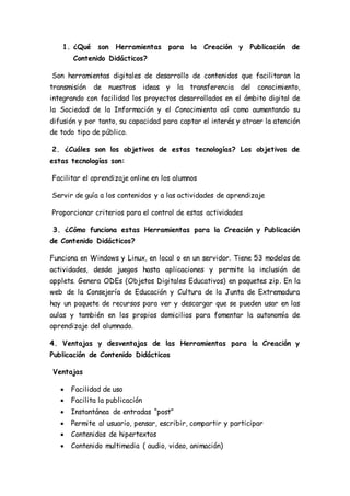 Este documento describe varias herramientas para la creación y publicación de contenido didáctico digital. Menciona 10 herramientas como Ardora, Constructor, Cuadernia, EdiLimes, EXe Learning, Hot Potatoes, JClic, Lams, Malted y Squeak, resaltando sus características. También describe las características y funciones de la herramienta eXeLearning, incluyendo sus actividades y capacidades para crear, publicar y catalogar contenido educativo digital.