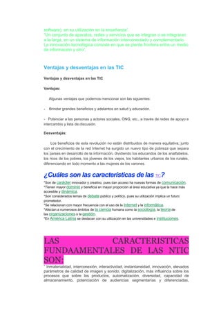 Este documento trata sobre las tecnologías de la información y la comunicación (TIC) y las nuevas tecnologías de la información y comunicación (NTIC). Define las TIC como los elementos y técnicas usadas en el tratamiento y transmisión de información, principalmente informática, internet y telecomunicaciones. Explica que las NTIC incluyen tanto las herramientas relacionadas con la transmisión, procesamiento y almacenamiento digital de información como los procesos y productos derivados de estas herramientas. También discute algunas ventajas