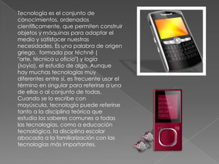 Este documento presenta un resumen de la tecnología y su historia. Explica que la tecnología se refiere al conjunto de conocimientos científicos que permiten satisfacer las necesidades humanas mediante la construcción de objetos y máquinas. Luego describe algunos hitos tecnológicos importantes como el desarrollo de herramientas de piedra, el encendido del fuego, la agricultura y la escritura. Finalmente, discute los impactos de la tecnología en áreas como la industria, el comercio,