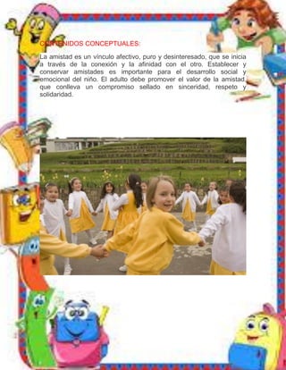 Este documento presenta un plan de lección sobre la amistad para estudiantes de primer grado. La lección cubre temas como la integración al grupo, la coordinación con los compañeros y la colaboración. Incluye actividades como hacer dibujos para regalar a un amigo, crear un cuento grupal y jugar pasándose una pelota mientras se nombran amigos. El objetivo es que los estudiantes reconozcan el valor de la amistad y aprendan a manejar sus emociones en las interacciones con los demás.