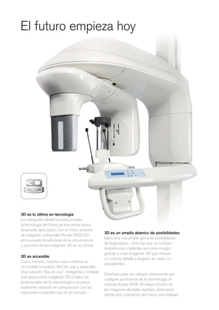 El documento describe un nuevo sistema de radiografía dental 3D llamado Kodak 9000 3D. Ofrece imágenes 3D y panorámicas de alta calidad a un bajo costo, lo que permite un diagnóstico más preciso y aplicaciones como endodoncias e implantes. El software incluido hace que el sistema sea fácil de usar y las imágenes pueden compartirse fácilmente.