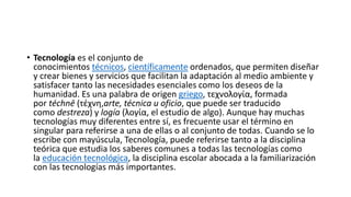 La tecnología se refiere al conjunto de conocimientos técnicos y científicos que permiten crear bienes y servicios para satisfacer las necesidades humanas y adaptarse al medio ambiente. Aunque la tecnología puede usarse para proteger el medio ambiente, su enfoque comercial a menudo satisface más los deseos de los ricos que las necesidades de los pobres, causando agotamiento de recursos. La tecnología se ha usado históricamente para satisfacer necesidades básicas, pero también para obtener placer y estatus, a