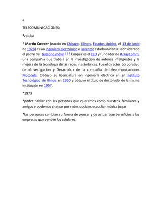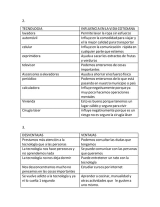 El documento describe varias tecnologías y cómo influyen en la vida cotidiana. La lavadora, el automóvil, el celular, la exprimidora y el ascensor hacen tareas más fáciles. El periódico y la televisión nos mantienen informados. La calculadora y la cirugía láser pueden influir negativamente si se usan de manera excesiva. La tecnología tiene ventajas como la comunicación y entretenimiento, pero también desventajas como distraernos de las personas y volvernos perezosos.