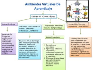 El documento aborda la educación virtual y los ambientes virtuales de aprendizaje, enfatizando su importancia en el proceso educativo a distancia y la interacción entre docentes y estudiantes. Se destaca el uso de herramientas tecnológicas como Moodle para facilitar la creación de cursos y la participación del estudiante, promoviendo un aprendizaje autónomo y colaborativo. Además, se mencionan aspectos clave como la motivación, accesibilidad y la evaluación del aprendizaje en contextos virtuales.