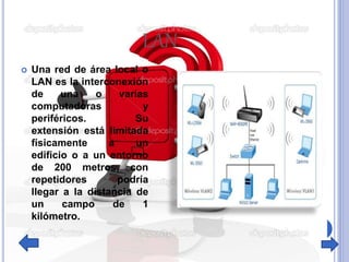 El documento describe conceptos fundamentales de redes de área local (LAN), incluyendo su definición, extensión física y el papel de los routers en la conectividad. También se menciona el ancho de banda como una medida de la capacidad de comunicación, así como la función de los cables transoceánicos para conectar países. Además, se presenta el sistema www como un medio para distribuir documentos interconectados a través de Internet.