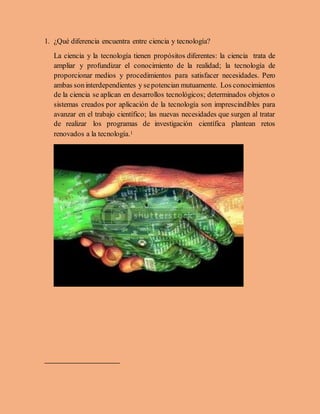 El documento discute las diferencias entre ciencia, tecnología, conocimiento científico y conocimiento tecnológico. Explica que la ciencia se enfoca en ampliar el conocimiento mientras que la tecnología busca satisfacer necesidades prácticas. También define artefactos como objetos diseñados para una función específica y menciona ejemplos de artefactos tecnológicos que ayudan en casa, trabajo y escuela. Por último, da ejemplos de procesos y sistemas tecnológicos como centrales hidroeléct