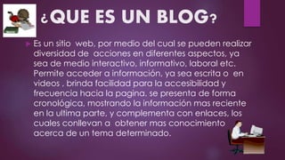 Este documento describe qué es un blog y algunas opciones para crear uno. Explica que un blog es un sitio web que permite compartir información como texto o videos de forma cronológica. Luego menciona algunos sitios populares para crear blogs como Blog.com, Blogger y Wordpress. También resume algunas ventajas como permitir divulgar información de forma confiable e interactiva de manera gratuita, y desventajas como que los usuarios pueden ser afectados por opiniones de seguidores.