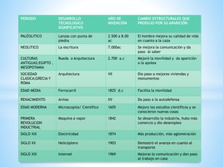 El documento resume los principales períodos de desarrollo tecnológico desde el Paleolítico hasta el siglo XXI, destacando las invenciones clave de cada era y los cambios estructurales que produjeron, como mejoras en la caza, comunicación, movilidad, vivienda, estudios científicos, industria, transporte y trabajo.