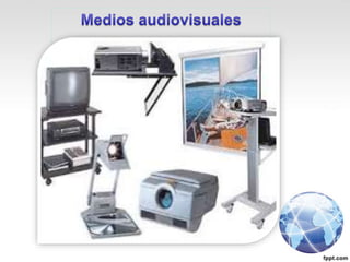 Este documento presenta información sobre los medios audiovisuales. Define los medios audiovisuales como aquellos que combinan imágenes y sonido para transmitir mensajes. Luego describe algunos medios audiovisuales clave como la televisión, el cine y el video. Explica brevemente cómo funciona cada uno y algunas de sus características.