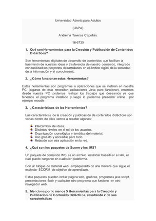 Este documento describe herramientas para la creación y publicación de contenidos didácticos digitales. Explica que estas herramientas facilitan la transmisión de ideas y contenido de forma integrada. Algunas características clave son el intercambio de ideas, organización del contenido y acceso gratuito. Luego menciona cinco herramientas como eXe Learning, ITE, Ardora, Cuadernia y Edilim, resaltando sus funciones. Finalmente, proporciona una definición y características detalladas de eXe Learning para