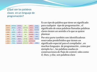 El pseudocódigo es un lenguaje simplificado entre el programador y la máquina que permite describir algoritmos. Las palabras clave en un lenguaje de programación tienen significados especiales para el compilador, como if, then y else. Compilar un programa implica traducir el código fuente a un lenguaje que la computadora entienda. Pseint permite escribir algoritmos de forma intuitiva y observar cómo cambia el resultado al modificarlos.