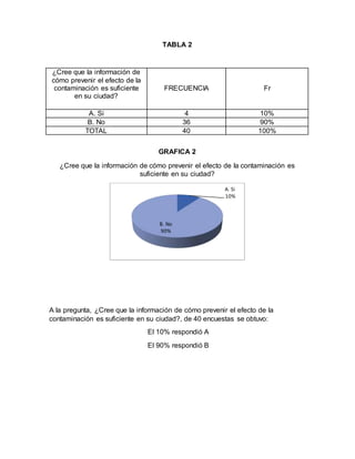 El documento presenta los resultados de 5 encuestas realizadas a 40 personas sobre temas relacionados con la contaminación ambiental y su prevención. La mayoría de los encuestados considera que la contaminación ambiental es un problema actual (92%), y que no hay suficiente información para prevenir sus efectos (90%). Todos apoyan las jornadas de limpieza en sus hogares (100%) y creen que el buen manejo de desechos contribuye a la preservación ambiental (98%). Sobre el enfoque CTS, el 70% respondió una opción y el 30% otra