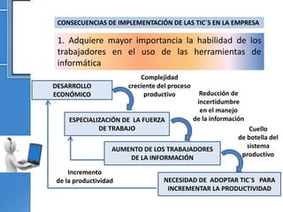 Este documento discute el rol de las tecnologías de la información y la comunicación (TIC's) en la producción, la estrategia digital y la economía. Explica cómo las TIC's pueden usarse en sistemas de fabricación flexibles, gestión de inventarios, órdenes de producción y otros procesos. También describe cómo las empresas pueden desarrollar estrategias digitales y los beneficios de implementar las TIC's, como la reducción de costos y el aumento de la productividad e innovación. Sin embargo, señala algunos desafí