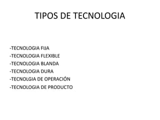El documento define la tecnología como el conjunto de conocimientos técnicos ordenados científicamente que permiten crear bienes y servicios para satisfacer las necesidades humanas. Luego describe seis tipos principales de tecnología: fija, flexible, blanda, dura, de operación y de producto. La tecnología fija no puede usarse para otros fines, mientras que la flexible sí permite crear nuevos productos. La tecnología blanda se refiere a información no tangible como la planificación, y la dura a conocimientos técnicos tangibles