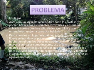 El lago del colegio ya no es un lugar de recreación y enseñanza debido a la contaminación y falta de cuidado. Esto afecta económicamente al colegio y daña el hábitat de los peces. Se proponen dos soluciones: 1) Recolectar fondos para limpiar y cercar el lago para protegerlo, y 2) Formar grupos de voluntarios estudiantiles que ayuden a cuidar el lago diariamente y sancionar a quienes contaminen.