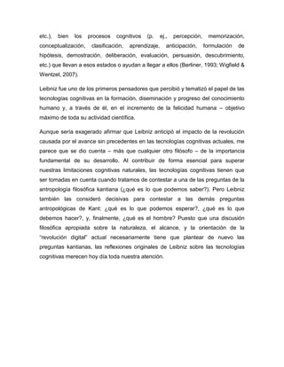 Este documento introduce el concepto de tecnologías cognitivas y discute algunos ejemplos históricos. Explica que las tecnologías cognitivas son aquellas creadas principalmente para servir a la cognición humana, como la resolución de problemas o el aprendizaje. Señala que Leibniz fue pionero en reconocer el papel de las tecnologías cognitivas para ampliar el conocimiento humano y la felicidad. También describe algunos dispositivos mecánicos tempranos como ejemplos de tecnologías cognitivas extern