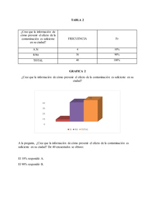 El documento presenta los resultados de una encuesta sobre contaminación ambiental y preservación del medio ambiente realizada a 40 personas. Muestra que la mayoría de los encuestados considera que la contaminación ambiental es un problema actual (93%) y que dar buen manejo a los desechos domésticos ayuda a preservar el medio ambiente (98%). Sin embargo, la mayoría también opinó que la información sobre cómo prevenir los efectos de la contaminación es insuficiente en su ciudad (90%).