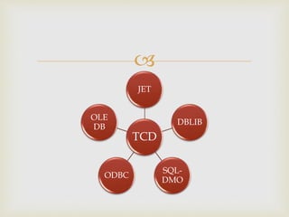 El documento compara diferentes métodos de acceso programático a datos, incluyendo DAO, RDO, ADO y ADO.NET. Explica que DAO se usa para acceder a datos locales mientras que RDO y ADO son más eficientes para datos remotos. ADO.NET reemplaza a ADO y consiste en proveedores de datos, conjuntos y adaptadores para transferir datos entre fuentes y conjuntos en memoria.