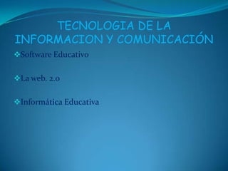 Este documento discute tres temas principales: el software educativo, la Web 2.0 y la informática educativa. El software educativo involucra psicología, matemáticas y computación. La Web 2.0, también llamada red social, permite que las personas contribuyan y se puede aprovechar en la educación a través de blogs, wikis y podcasts. La informática educativa surge de la integración sinérgica entre la informática y la educación a múltiples niveles usando las herramientas de cada disciplina.
