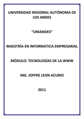 El documento presenta las nuevas tendencias tecnológicas para Internet, dispositivos para PC y redes informáticas y comunicaciones según un módulo de la Maestría en Informática Empresarial de la Universidad Regional Autónoma de Los Andes impartido por el Ing. Joffre León Acurio en 2011. Se analizan las nuevas tendencias tecnológicas para Internet del futuro, dispositivos para PC y redes informáticas y comunicaciones.