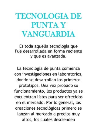 El documento habla sobre la tecnología de punta y vanguardia. Explica que este tipo de tecnología se desarrolla recientemente y es avanzada, comenzando en laboratorios con prototipos antes de lanzarse al mercado a altos precios que luego bajan. También menciona ejemplos actuales de tecnología puntera como nuevas pantallas, laptops, smartphones y más. Finalmente incluye un crucigrama con definiciones de términos tecnológicos como app, iPhone, Android y otros.