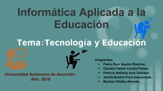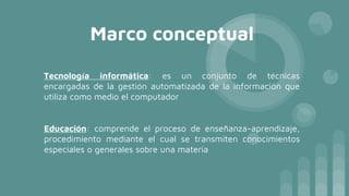 El documento trata sobre la tecnología educativa. Explica que la tecnología educativa aplica la tecnología de la información para mejorar las técnicas de enseñanza y aprendizaje. También describe los beneficios del uso de la tecnología en la educación, como facilitar la comprensión de los contenidos, promover la autonomía y el trabajo en equipo. Concluye que el uso de las tecnologías de la información y la comunicación es necesario en la educación actual para transmitir conocimientos de manera eficaz.