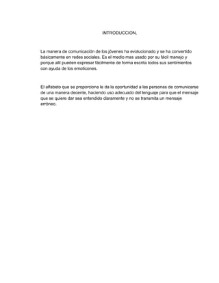 Este documento trata sobre las competencias comunicativas en las redes sociales. Explica que los jóvenes usan principalmente las redes sociales para comunicarse debido a su facilidad de uso y la habilidad de expresar sentimientos con emoticones. También discute la importancia de usar el alfabeto de forma adecuada para transmitir mensajes claros. Incluye preguntas y respuestas sobre el uso apropiado del lenguaje en las redes sociales y cómo los emoticones fortalecen la comunicación.