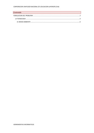 El documento resume las relaciones entre la tecnología, el medio ambiente y la contaminación. Explica que aunque la tecnología ha causado contaminación, también puede usarse para proteger el medio ambiente, por ejemplo mediante satélites para prevenir incendios forestales. El documento analiza los problemas ambientales causados por actividades tecnológicas como la desertización y la generación de residuos, pero también cómo la tecnología puede usarse para el reciclaje y energías renovables. Finalmente, propone soluciones como leyes medioambientales y educ