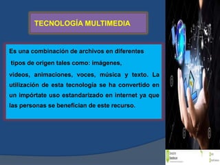El documento describe la tecnología multimedia, incluyendo sus tipos de información, características, ventajas y desventajas. También cubre la evolución de la multimedia a través de los años y los diferentes tipos como educativa, publicitaria, comercial e informativa. Además, explica brevemente el código QR, su propósito y lo que puede contener.